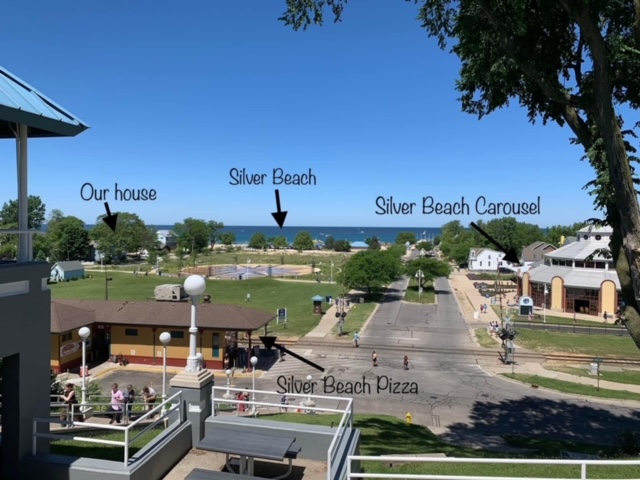 Walk out the front door with beautiful Silver Beach just steps to your left and Silver Beach Pizza steps to your right. Experience the joy and convenienceĀ of the giant splash pad, a family favorite in St. Joe, right in front of the house! You can feel the mist from the splash pad when the wind blows and smell the delicious aroma of Silver Beach Pizza from the cozy screened-in porch on the lower level! Walk up the stairs onto the bluff and enjoy all of the wonderful restaurants, ice cream shops, and shopping that St. Joe has to offer. And the sunsets... the most beautiful in Michigan!